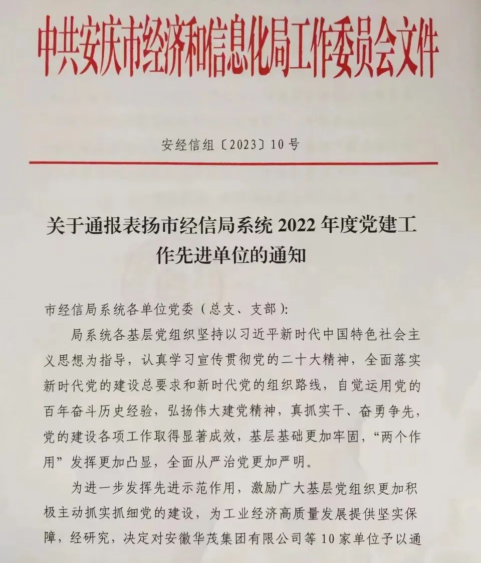 安(an)徽向科(ke)黨委(wei)榮獲安(an)慶市(shi)經(jing)信(xin)跼(ju)係(xi)統2022年(nian)度黨建(jian)工(gong)作(zuò)先(xian)進(jin)單(dan)位榮譽稱号